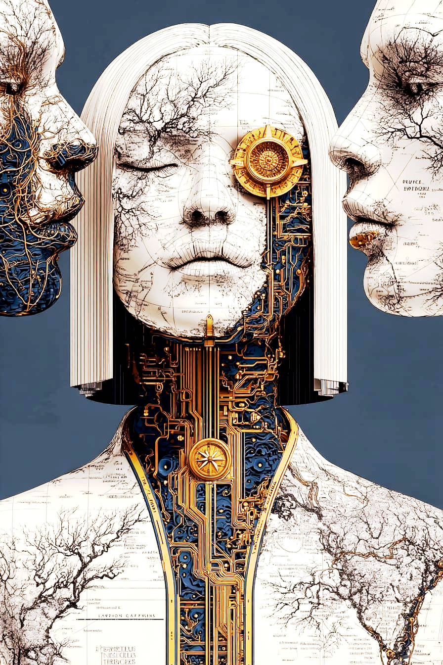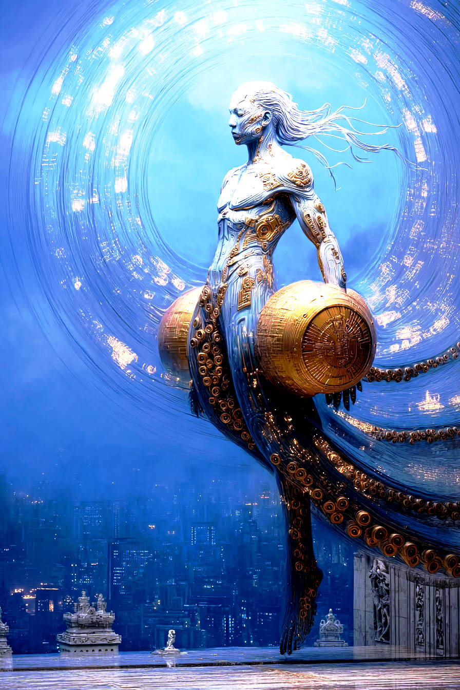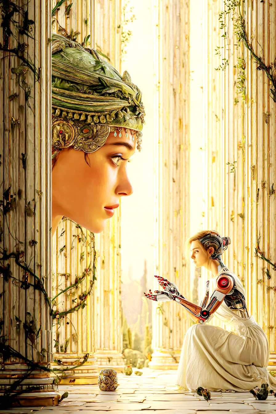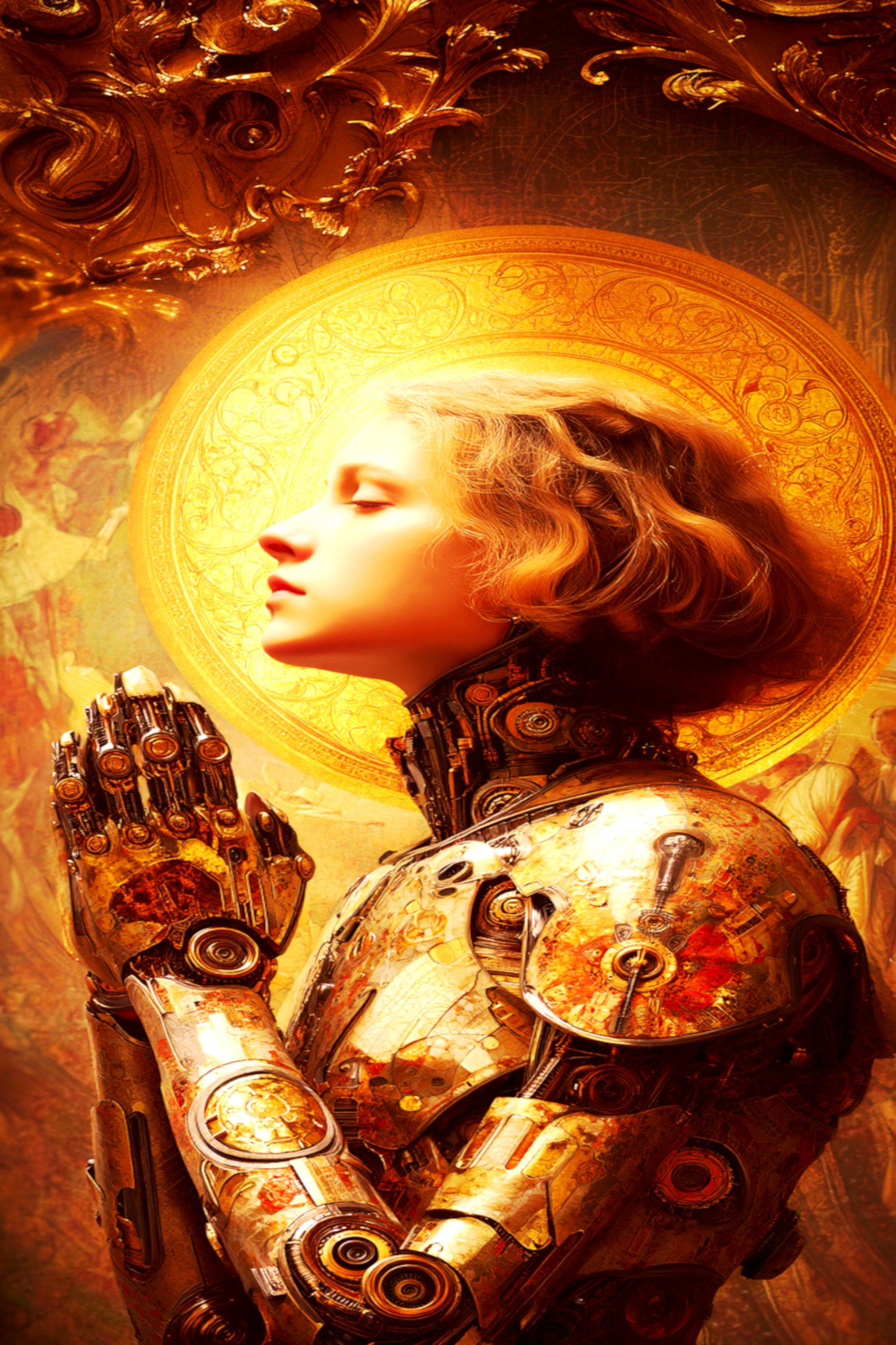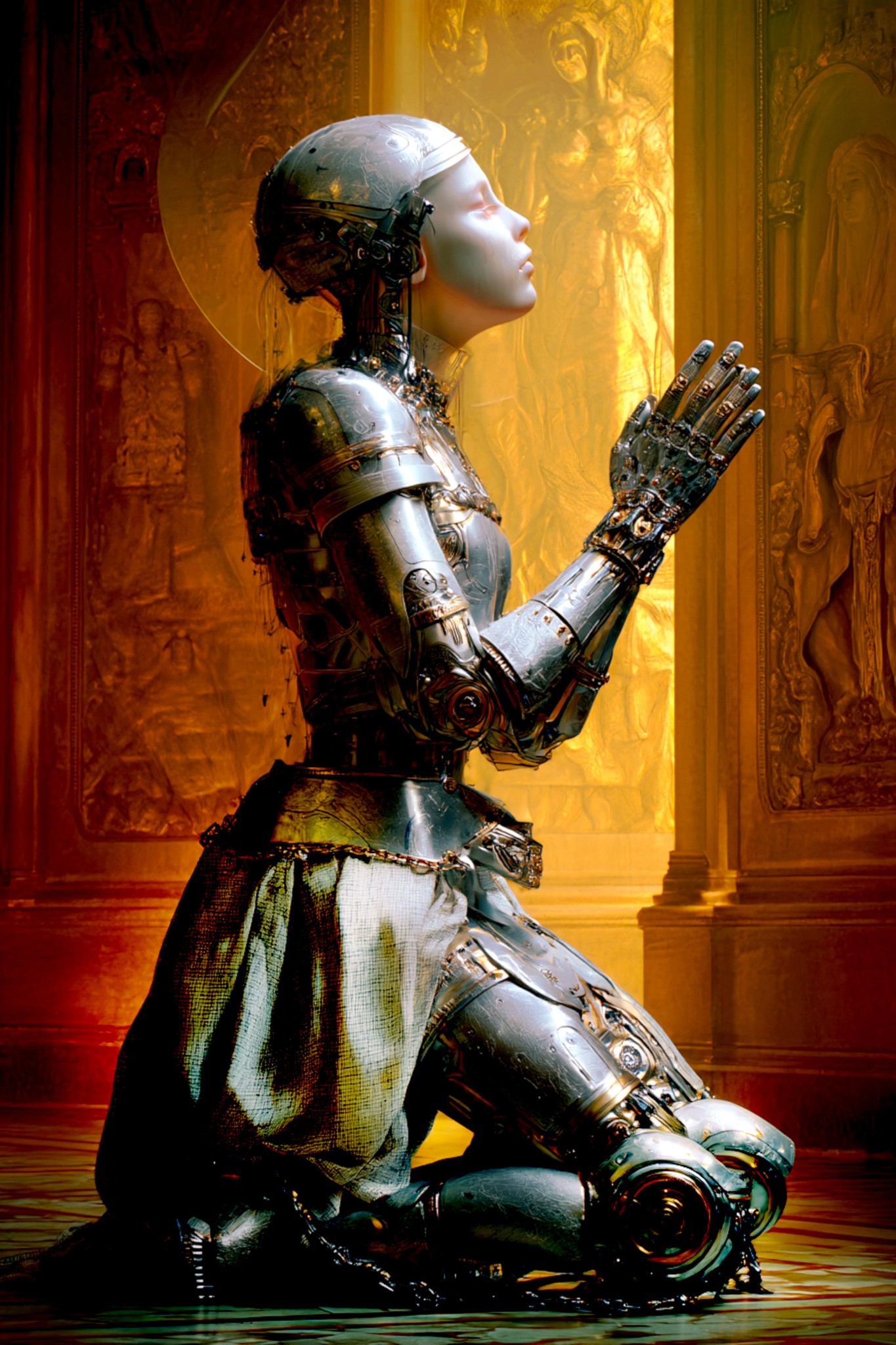Sacred Mechanica fuses devotion and cybernetics across twenty arresting scenes. Already, a single tear rolls down a robotic cheek—a digital rosary slipping between steel fingers—revealing that emotion endures even after flesh fades. Bionic silhouettes bow before altars of glowing circuitry, their chrome arms entwined with fiber-optic prayer beads. Neon halos and fractal patterns pulse over burnished golds and electric blues, transforming each image into a futuristic sanctuary. From the solitary meditation of mech-monks to grand ceremonies beneath chromed arches, Sacred Mechanica redefines the sacred in a post-human age.