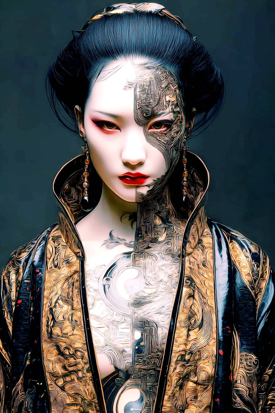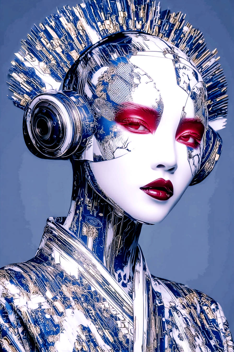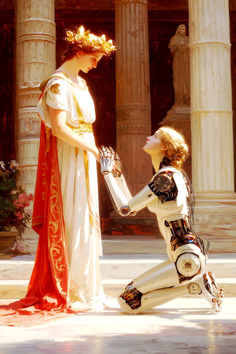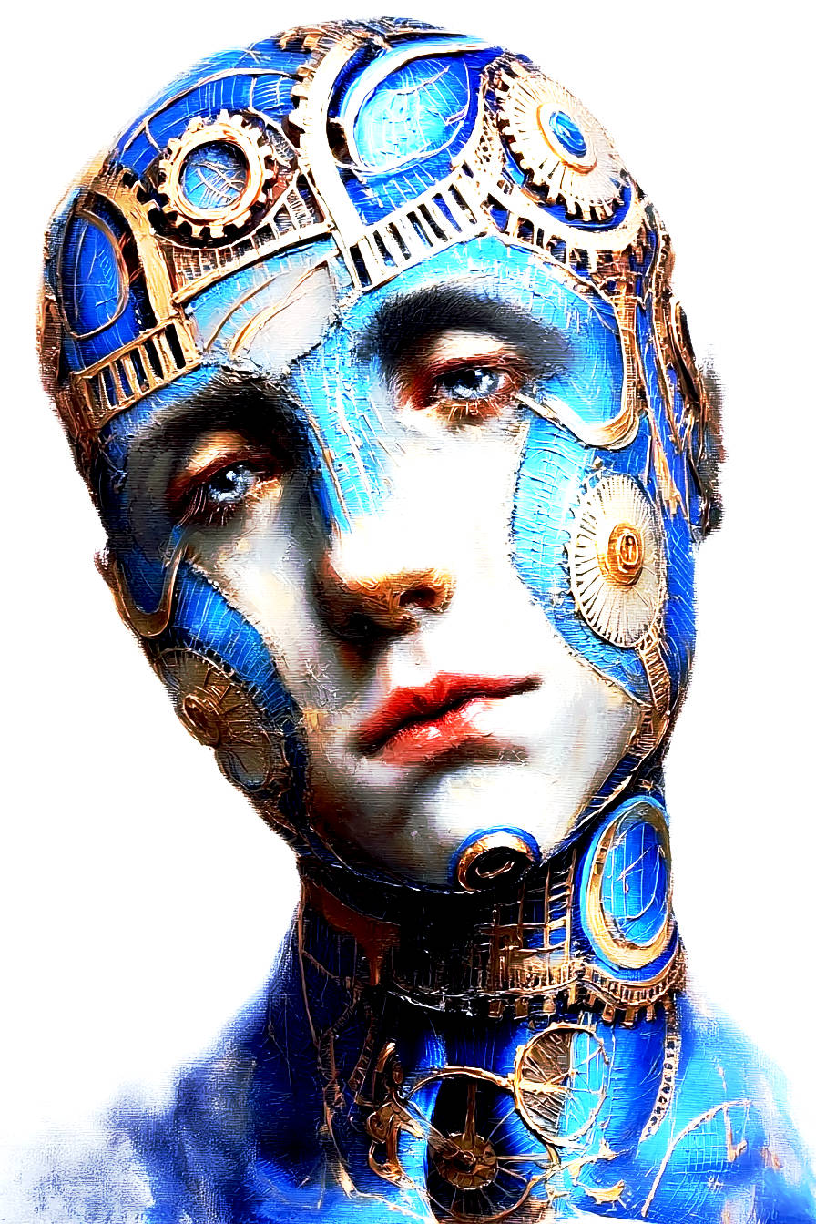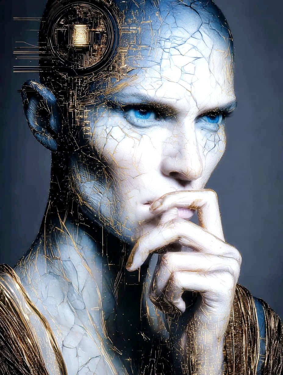 Sacred Mechanica fuses devotion and cybernetics across twenty arresting scenes. Already, a single tear rolls down a robotic cheek—a digital rosary slipping between steel fingers—revealing that emotion endures even after flesh fades. Bionic silhouettes bow before altars of glowing circuitry, their chrome arms entwined with fiber-optic prayer beads. Neon halos and fractal patterns pulse over burnished golds and electric blues, transforming each image into a futuristic sanctuary. From the solitary meditation of mech-monks to grand ceremonies beneath chromed arches, Sacred Mechanica redefines the sacred in a post-human age.
